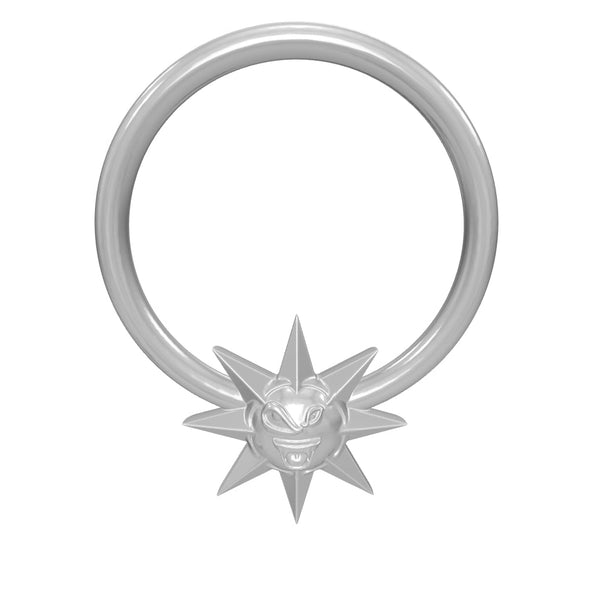 The Sunny Septum features our Sunny the Somber Sun character – his face twisted in a fierce expression as he tries his best to hold together his feelings. This septum ring captures his delusional state of mind, symbolizing the power of raw energy and emotion. Requires a septum piercing to wear.