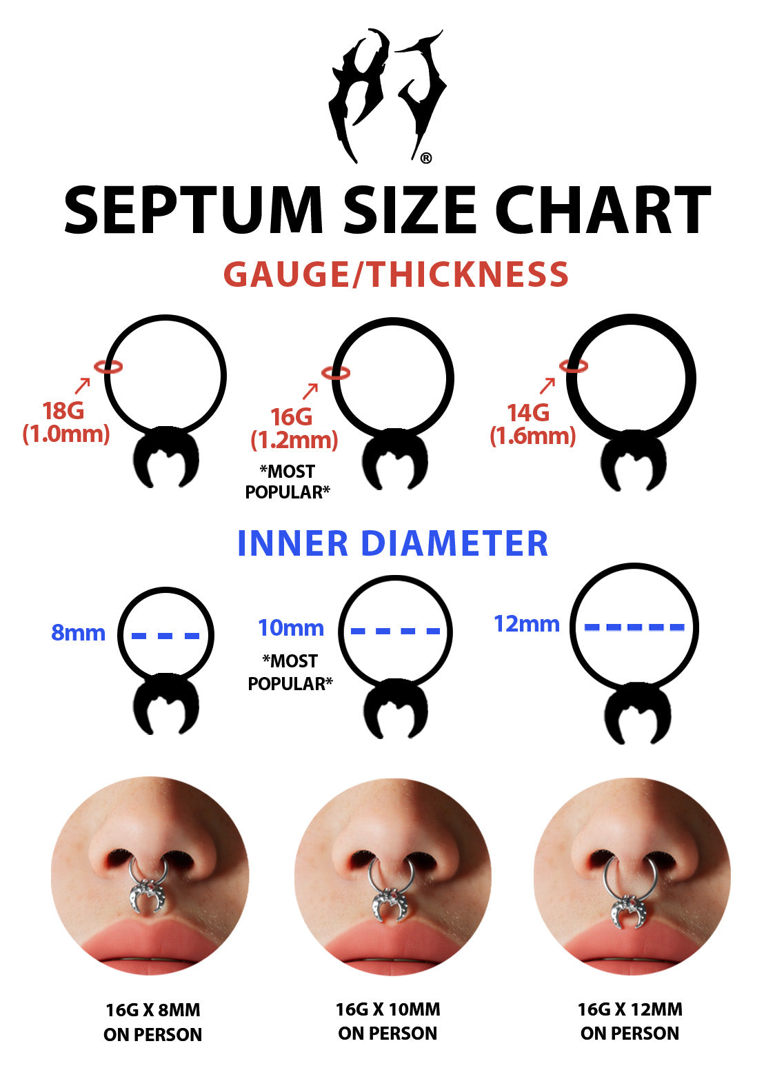 Featuring a cracked skull impaled by spikes, this septum shows the unfortunate reality of those who challenge the status quo. Although terrifying, don’t let it stop you from speaking your truth.