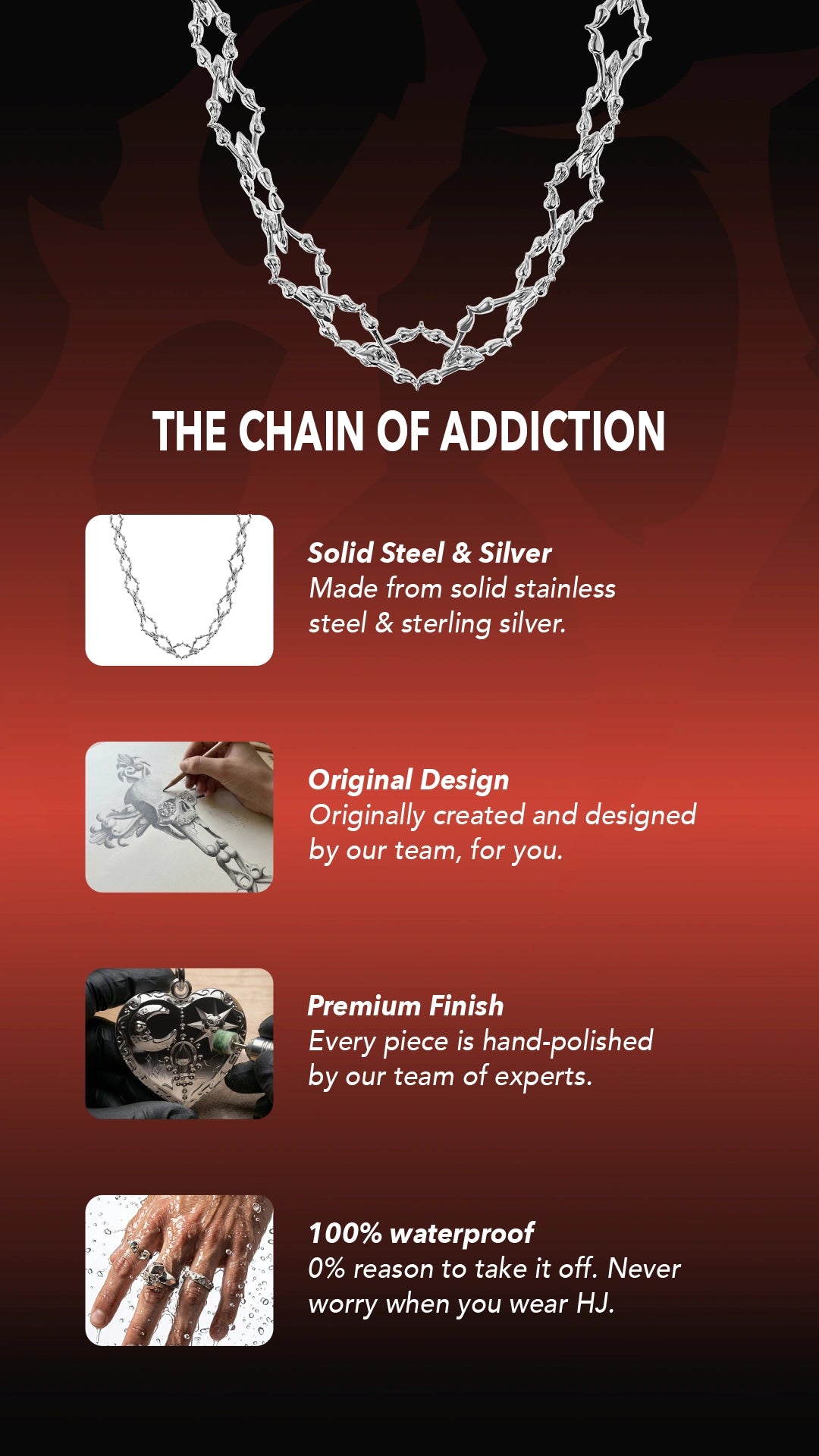 The hidden clasp featured on this chain symbolizes breaking the cycle. We wanted to showcase that everybody's road to recovery is different and never obvious.