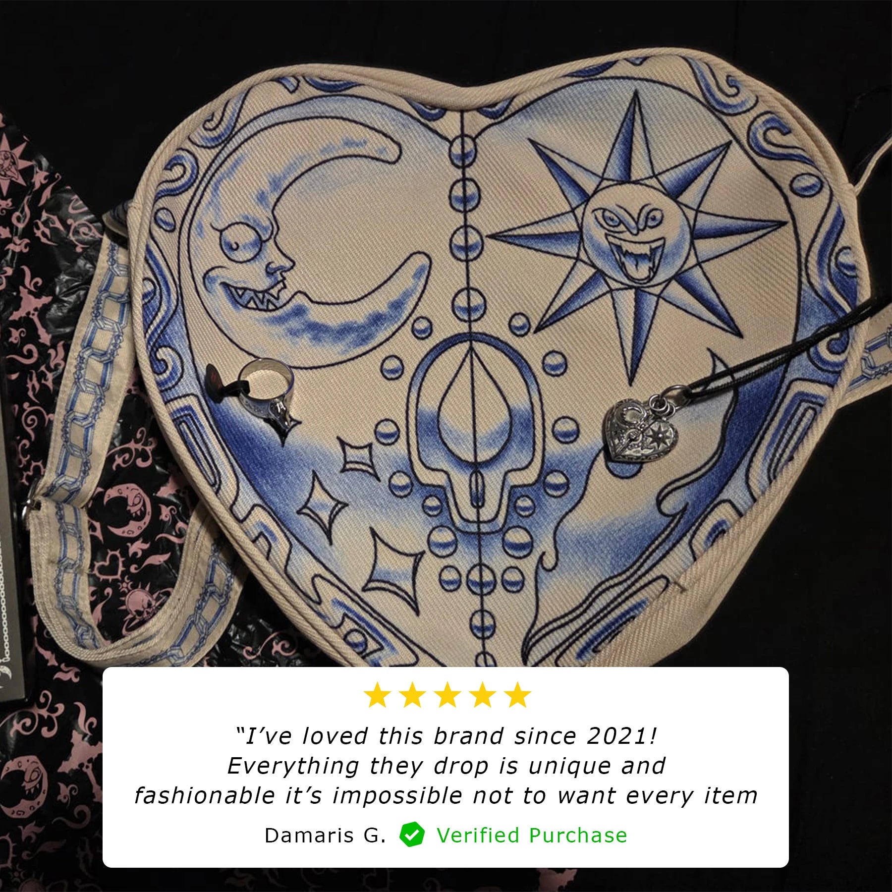 Our Cosmic Heart Tote Bag is in the shape of a heart and features our iconic Cosmic Heart design, turning an ordinary tote into wearable art.