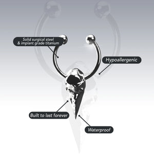 For you, our hardcore hero. The Faux Plague Doctor Septum symbolizes your ability to adapt and endure, even in the face of death. Depicting the final remains of a withering crow, this piece embodies respect for the cycle of life and acknowledgement of the cruelty of death.