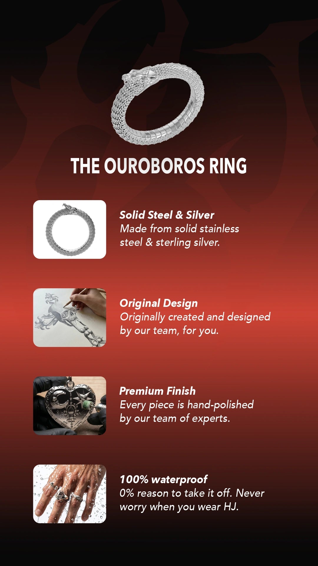 Our Ouroboros Ring features a serpent eternally consuming its own tail in an unbroken circle – an ancient symbol that represents the endless cycle of life, death and rebirth.
