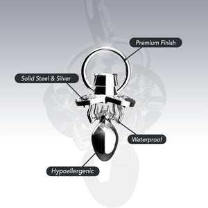 Our Pacifier Earring depicts the trap of escapism: the thing you’re using to ‘escape’ is only silencing your distress, and never getting to the root cause. The spider sits patiently, hiding its poisonous attack behind a shield with pill-shaped ventilation holes, a hallucinogenic design, and an alcohol bottle backing – representing the common traps we fall into when times get tough.