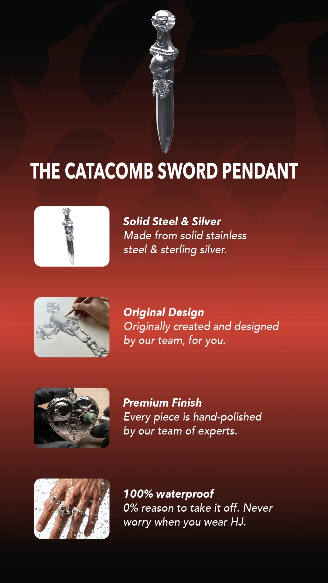 Some of the world’s scariest sights are buried deep underground, hidden in the catacombs. Our Catacomb Sword Pendant is our take on a slim and sleek pendant that still offers a fashionable design. The tastefully detailed sword and skeleton come together to add a layer of style to almost any outfit.