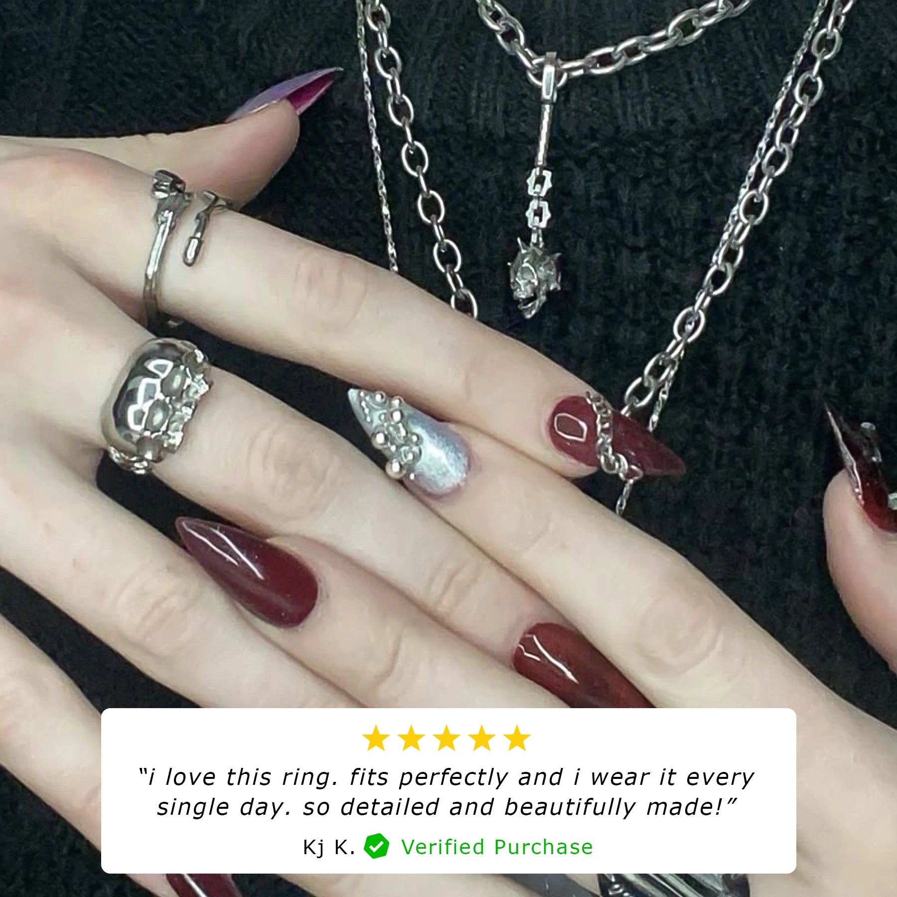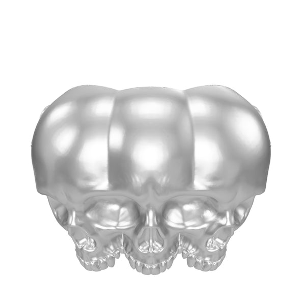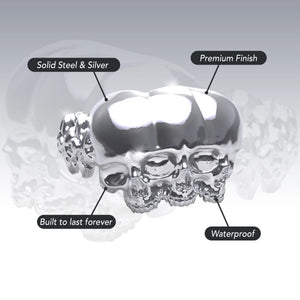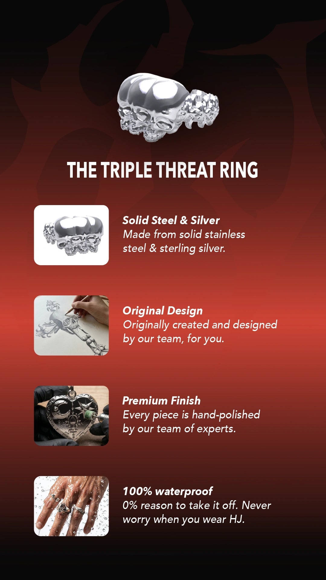Tragedy never feels like it has an end. Our Triple Threat Ring is a depiction of the phrase “When it rains, it pours.” Three skulls connected by a spinal cord ring, this unique piece is a reminder that the most important time to keep going is when you feel like giving up.
